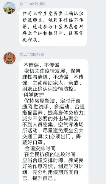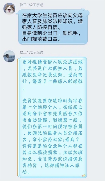 各支部开展线上讨论,各位大学生党员结合近段时间的心得收获,纷纷袒露自己的心声,为抵抗和战胜这次来势汹汹的疫情献出自己的绵薄之力。通过线上讨论一系列疫情防控文件精神,对防控新冠肺炎的看法和注意事项,以及作为大学生党员在这次新冠肺炎疫情中能做些什么,让广大学生党员同志学习更多的关于新型肺炎病毒的防控知识,在这场疫情防控阻击战中做到不信谣、不传谣、不造谣,做好正确的舆论引导,运用学习的专业知识,为疫情防控出一份力,坚决打赢疫情防控阻击战!