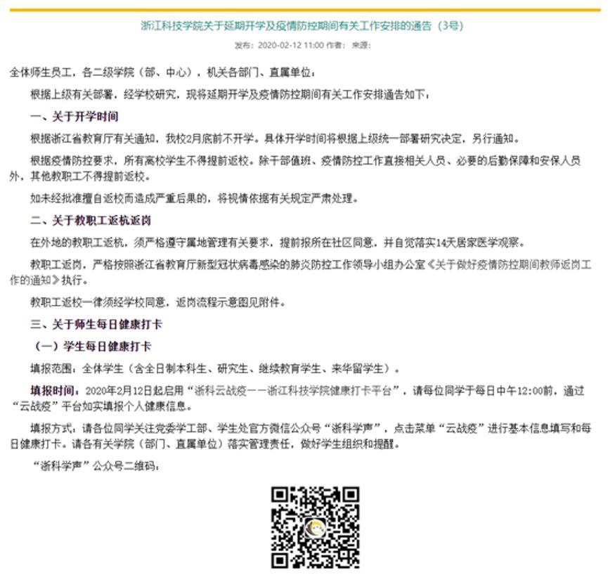 关于延期开学及疫情防控期间有关工作安排的通告。要重视在云战役上的每日健康打卡,主动在规定时间完成,并且遵守学校相关规定,不能提前返杭。虽然目前疫情的形式有所好转,但是我们不能有丝毫的松懈,在疫情结束之前,每一个人都不能掉以轻心。