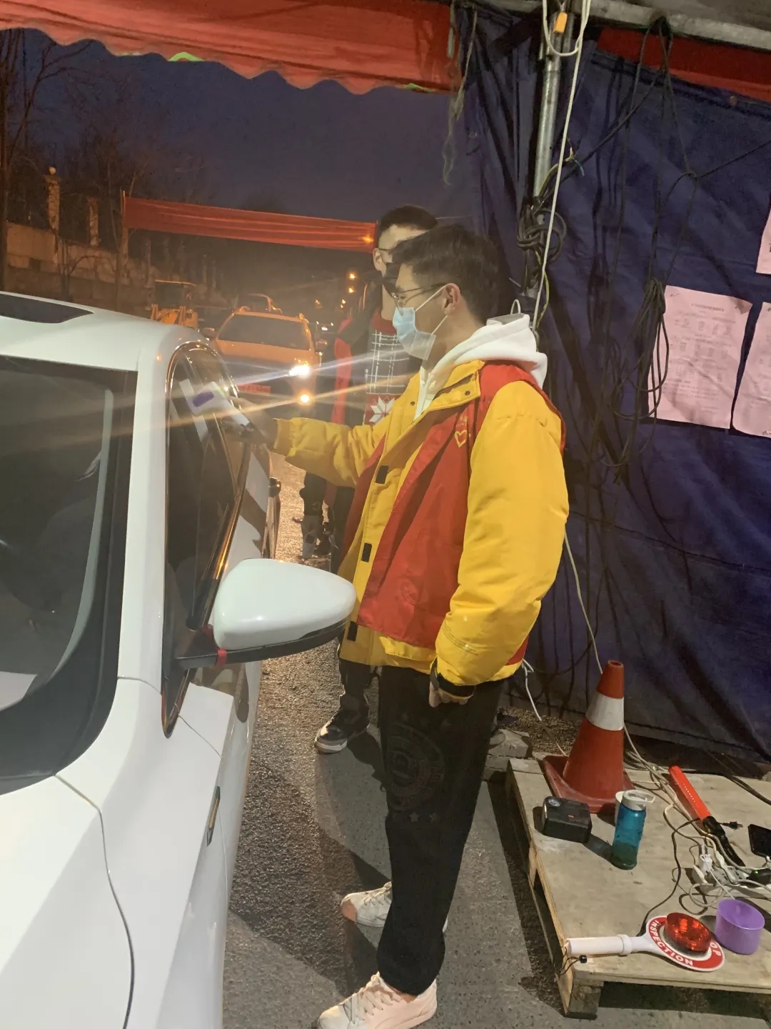 计科172徐凌云同学,作为新时代的大学生,积极参加防疫志愿者活动。协助乡镇干部设立检查站、关口,检查来往车辆以及行人的出入证明,并询问此次出入所去的场所及去该地的目的,同时给出入人员测量体温。我们这边采取两天一出入的规则,所以大部分人是去菜市场等地来满足日常生活需求。