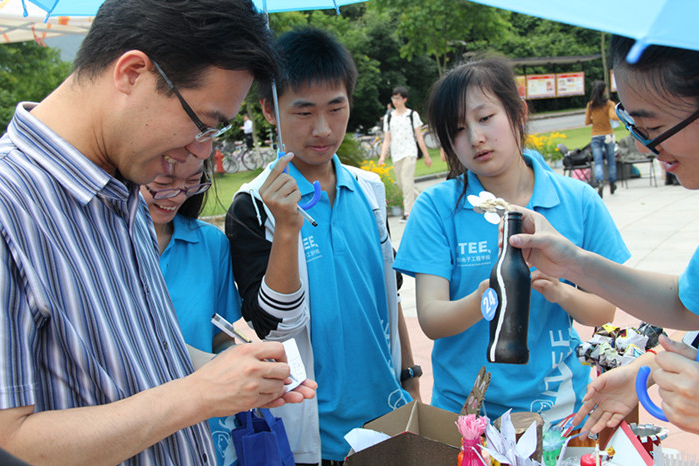 12点20分,“信息蓝—扇子舞”首先登场。蓝色的伞伴随着音乐与阳光,拉开了闭幕式的帷幕。接着,“变废为宝”展示开始,学生会成员一件件自制的“艺术品”登场。这些令人耳目一新的作品,赢得了在场观众的热烈掌声。同时进行的跳蚤市场,吸引了不少同学甚至外国留学生,驻足挑选。随后,“T台环保服装秀”闪亮登场,一件件用环保材料制作的创意服装,在模特身上展示出了别样的美丽,不说美轮美奂,却都是同学们巧思构想、精心设计的结果,别样的材质展示了别样的美丽。最后,信息91制片厂