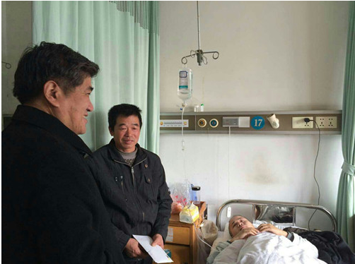 党总支副书记姜国泉,以及张艺在校期间的班主任、辅导员代表师生看望张艺及他的家人,亲手将爱心募捐所得交到了张艺父母的手上,传达了全校默默支持他的师生的美好祝愿,希望张艺坚强、乐观,直面生活,战胜病魔。母校是他身后坚强的后盾!温情的话语,给冰冷的病房带来了冬日里的温暖。