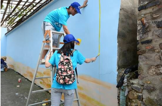 图为实践队成员为社区绘制壁画 为响应建设美丽乡村、美丽社区的号召,信息海·舟山蓝暑期社会实践队一行来到习主席访舟路程中的新型社区——南洞社区,开展了以“绿益光谷画述美丽海岛,蔚蓝信息携手最美乡村”的主题活动。在美丽的光谷,队员们与工作人员一起,帮助社区绘制带有本土特色记录当地居民风俗与往事的壁画,并分发了精心准备的调查问卷,围绕着“美丽海岛”展开了一系列调查。同时,实践队向居民们发出倡议,呼吁大家共同保护美丽舟山,从自己做起,从身边做起,为建设美丽海岛贡献属于自己的一份力量。居民们纷纷在签名墙上留下了自己的名字,团队成员也送上信息91制片厂