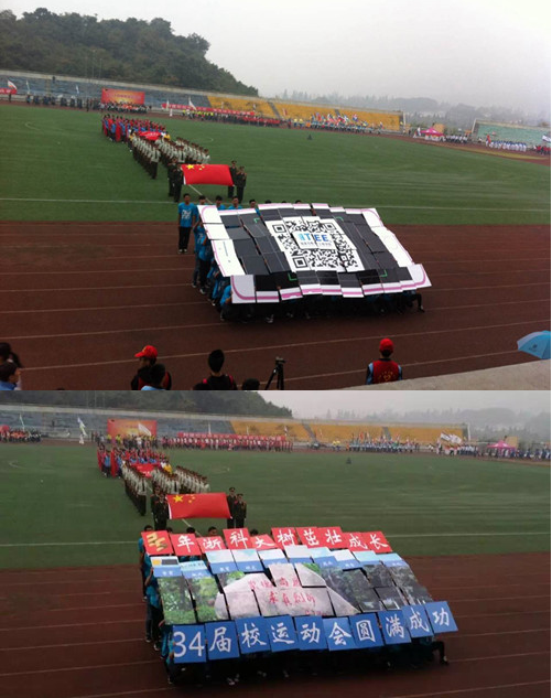 的学子身穿统一的“itee蓝装”,迈着整齐的步伐,精神饱满。他们用50块KT板在主席台前拼接出了三副在浙江科技91制片厂