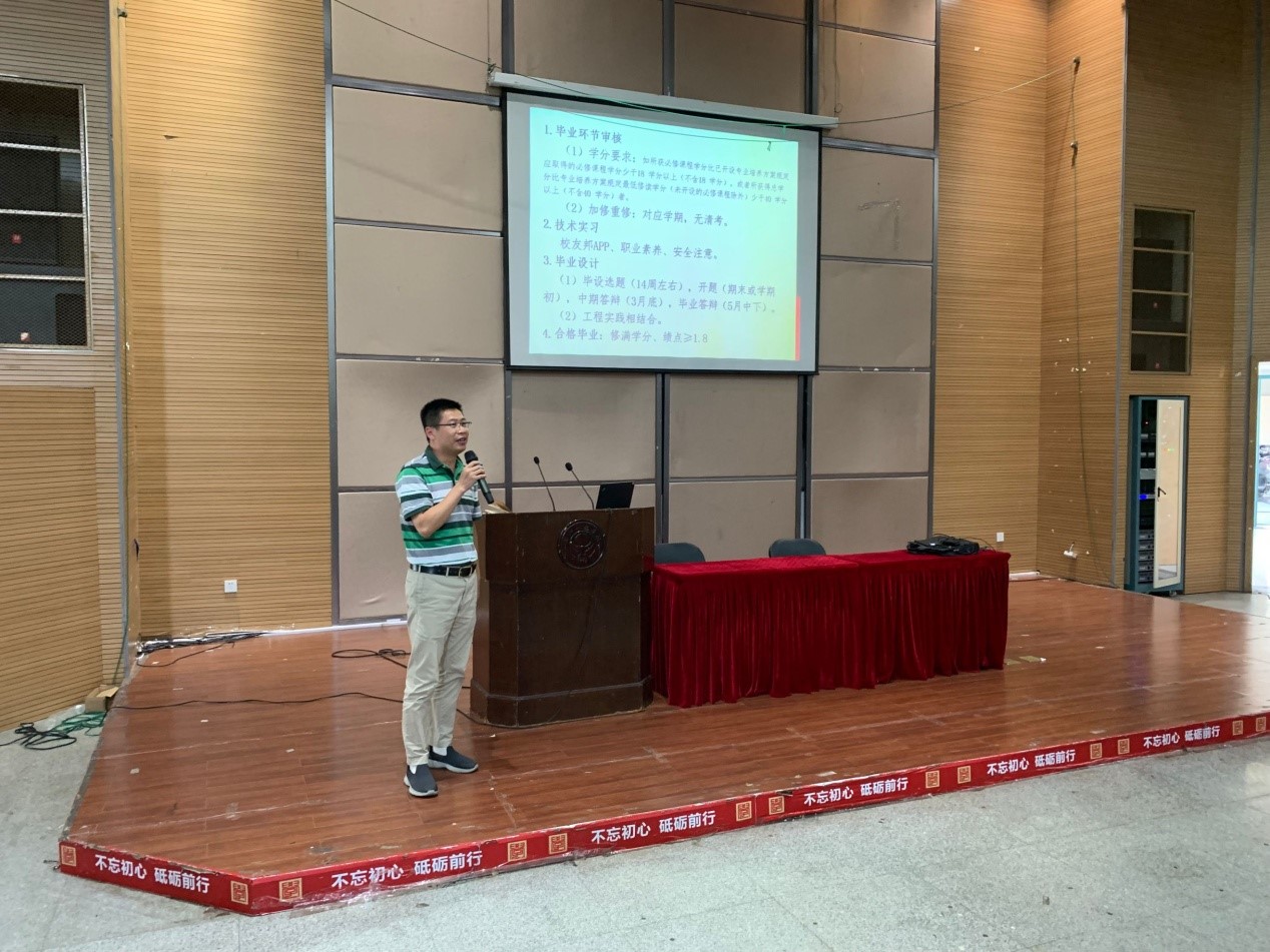马伟锋就毕业学分审核、学历学位授予、技术实习以及毕业设计答辩等进行了详细的说明,并希望同学们认真对待学业,积极关注就业,做到学业与就业两不误、相促进。单玉成就2016级毕业生的就业工作作了动员。他强调,要明确职业目标,增强就业主动,提升就业核心竞争力,同时在就业及实习实践的过程中要注意增强安全防范意识。