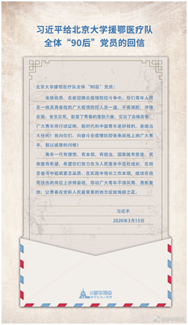 中共中央总书记、国家主席、中央军委主席习近平3月15日给北京大学援鄂医疗队全体“90后”党员回信,向他们和奋斗在疫情防控各条战线上的广大青年致以诚挚的问候。