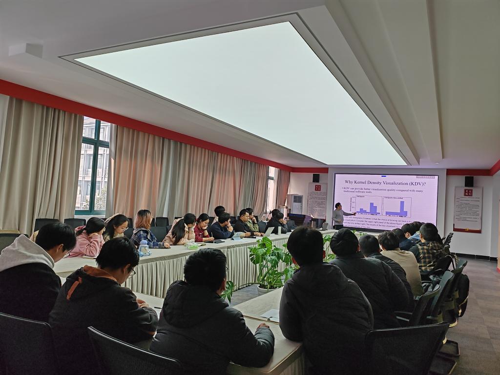 陈教授从核密度可视化算法的优化方法、相关理论依据以及其未来应用和挑战等方面进行介绍,开拓了参会师生的学术视野。在交流环节,大家就其涉及的优化思路和公式展开了热烈讨论,共同探讨领域前沿的技术与学术理论,丰富了同学们的知识体系。